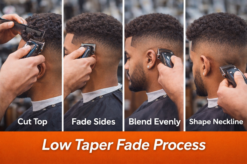 Ask your barber clearly: “I want a low taper fade with length on top.” Barbers often suggest the low taper fade for clients who want a clean look without committing to a high or skin fade.