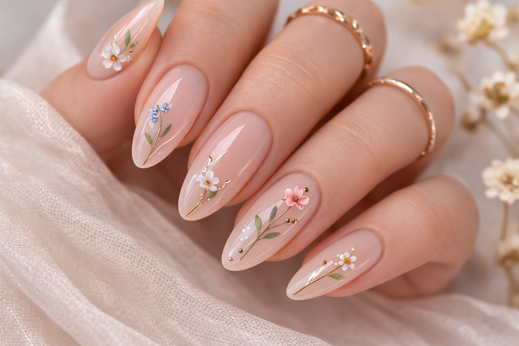 Mini daisies, soft pressed-flower effects and tiny petal accents align perfectly with UK wedding and garden party season.